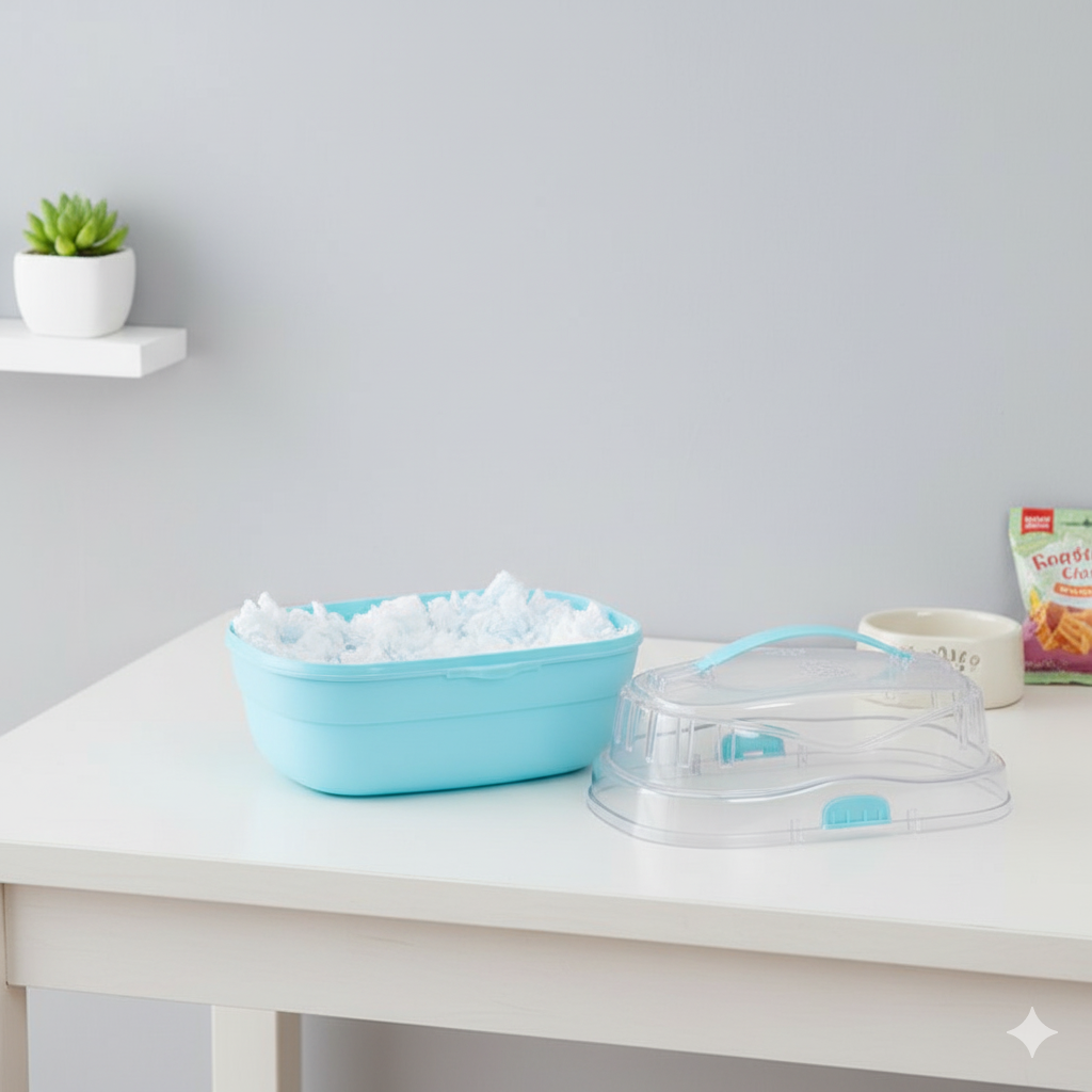 Fabricada con plástico resistente y no tóxico, esta transportadora mantiene un ambiente limpio y libre de olores desagradables. Su tapa transparente permite observar a tu mascota en todo momento, y su diseño incorpora múltiples orificios de ventilación que aseguran un flujo de aire adecuado, manteniendo a tu roedor cómodo y relajado.